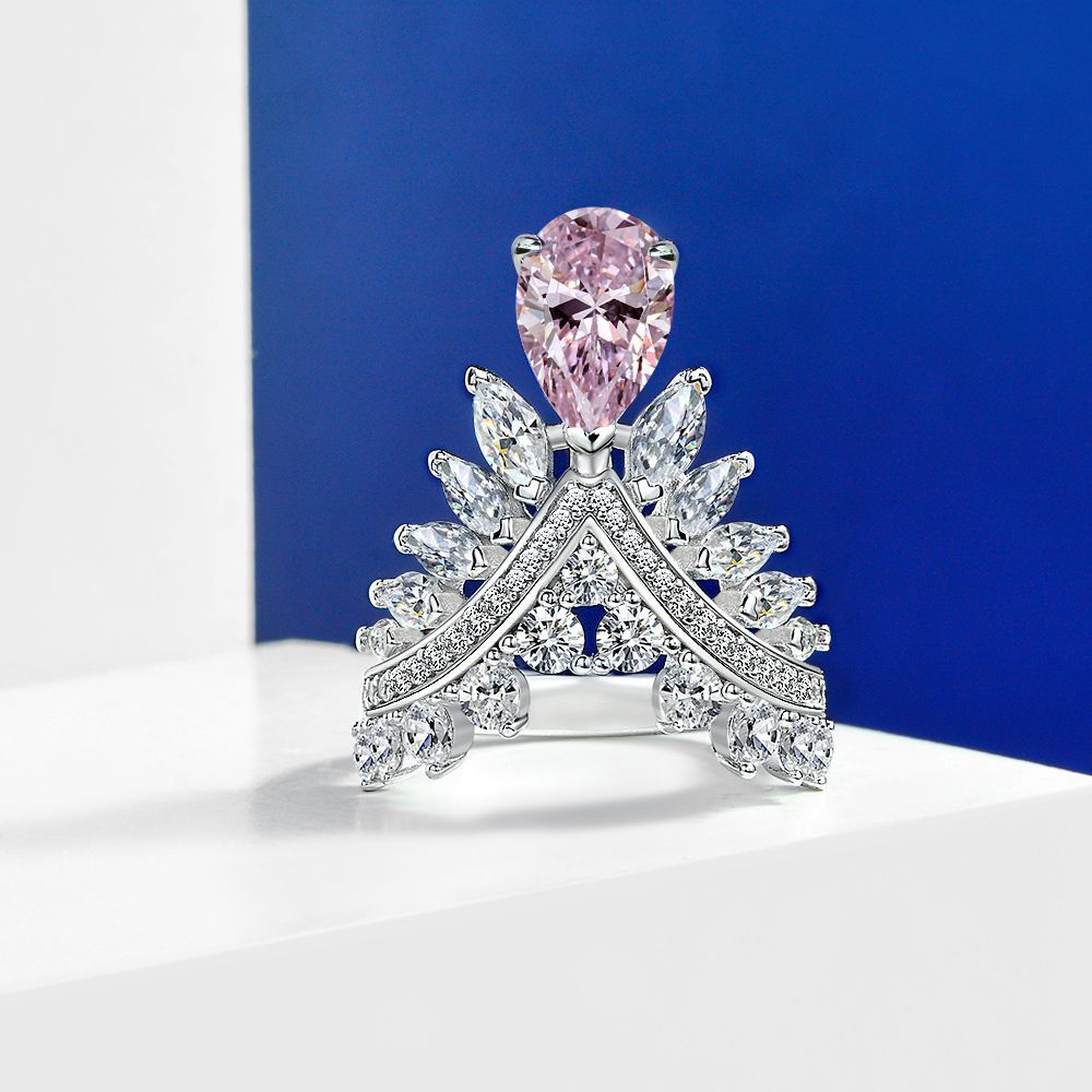 > 2022新款梨形7*10羽毛皇冠戒指高级感高碳钻粉s925银女戒