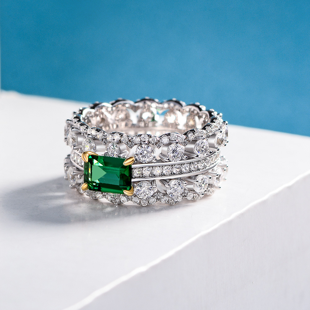 > S925纯银手饰女绿钻镶嵌欧美奢华几何型双排满钻1ct戒指